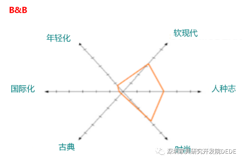 如意大利著名品牌MDF遵循的是:白色、简单、最小化、功能化这四个关键词,见图6所示;LAGO品牌遵循的是: 革新、多彩、可爱这三个关键词;而B&B的关键词则是:设计导向、高雅、意识流。这些关键词既是品牌个性的表征,同时又与其市场定位密切相关,如B&B对应的市场定位是一个多维模型,详见图7所示
