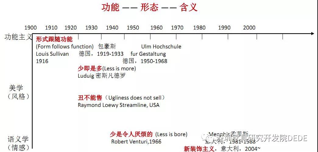 图6是二十世纪100年中全球设计思潮的变迁,其中有三个具有里程碑意义的美学价值取向,即:功能主义、美学风格、语义学情感。从“形式追随功能”、“少即是多”、“丑不能售”、“少是令人厌烦的”,到后现代主义与新装饰主义,清晰地反应出了其流变的脉络。