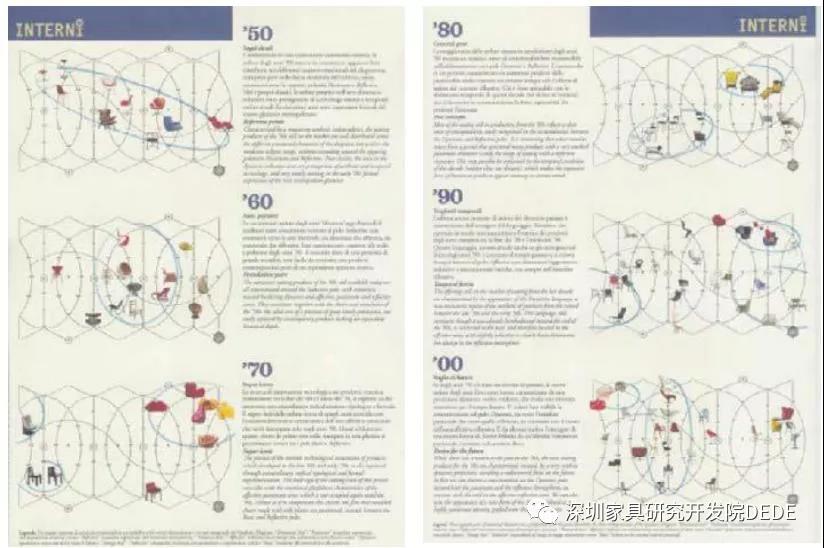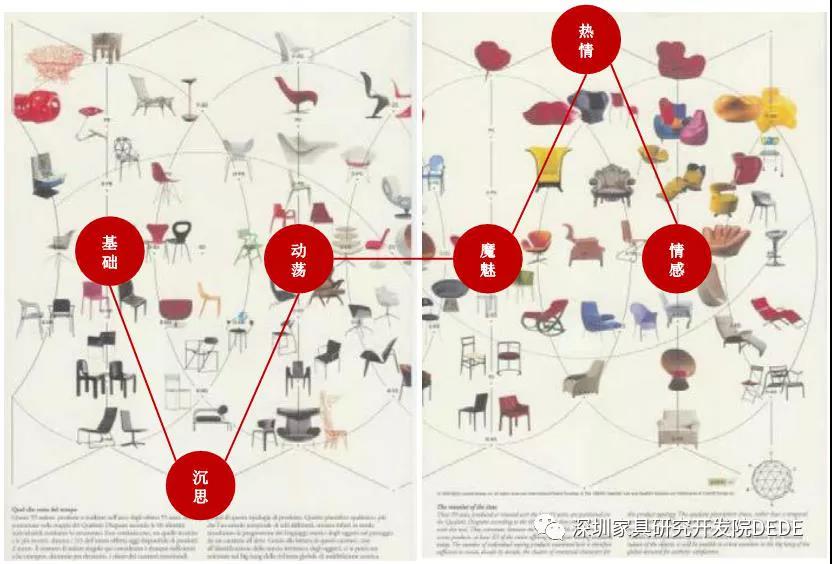 图7是二十世纪下半页五十五年99张椅子所呈现出来的特征,按照每十年一个时间刻度来进行分析,对应六个关键词,即:基础、沉思、动荡、魔魅、热情和情感,见图8,这是与不同时期的历史背景分不开的。五十年代是二战刚刚结束,百废待兴,需要最基本的物资供应;六十年代经济好转,人们开始思考未来的发展方向;73年的能源危机使得世界经济大萧条,整个七十年代处于动荡之中;八十年代经济繁荣、以计算机为标志的科技高速发展,设计呈现出巨大的魅力;九十年代冷战结束,全球化加速,设计界热情洋溢;98年金融危机导致全球经济危机,理性、冷静回归,同时,步入二十一世纪人们更加追求内心深处的真情实感。但无论语义学怎么流变,这些都属于现代风格,而全球设计师和企业在具体设计表达上则是百花齐放百家争鸣的,没有人可以给出标准的答案和模式,世界也因此而精彩纷呈。