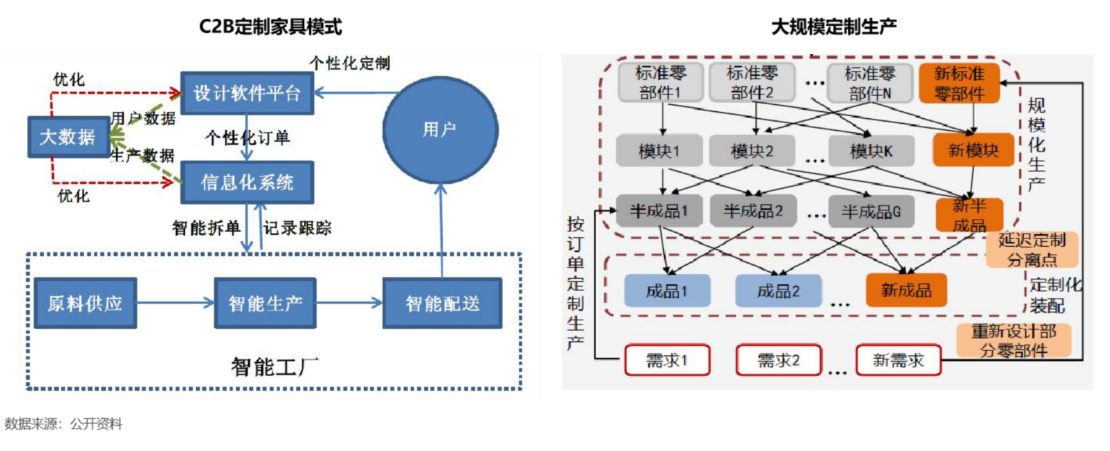 当前,定制家具行业由以往的 B2C 模式发展成为反向的 C2B 模式,其着重点由生产者转移到消费者:消费者通过平台上生成的个性化订单,拆解为标准化的构件订单,传送到各个生产部门,通过智能混合排产的方式实现物料的最大化利用,即从个性化订单的生成到原料供应、生产、分拣、包装以及配送安装和售后,形成完整的闭环。