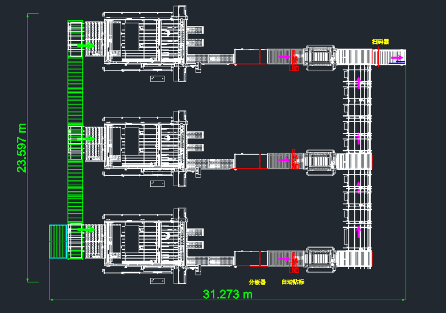 以上是电子开料锯智能工作站的方式,六台电脑进行组合,上料的部分是通过输送台到电子锯进行开料,每台机器只需配备一人。