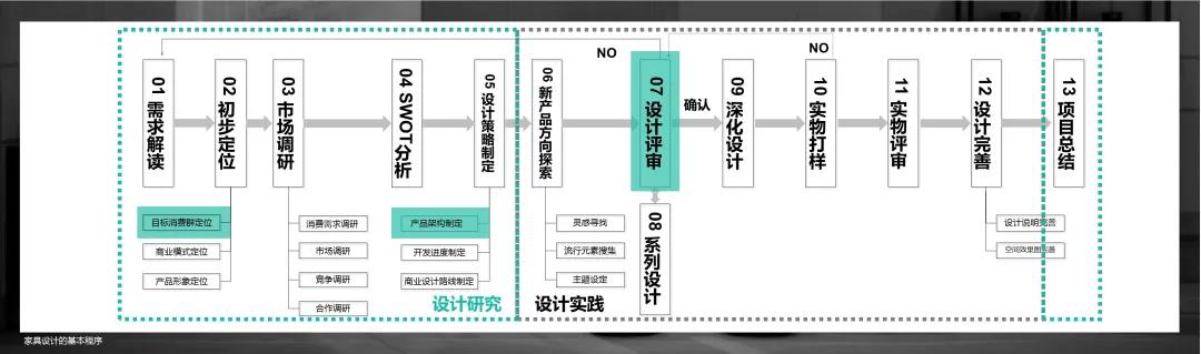 根据实践经验,与大家分享设计程序的13个步骤,即如上图流程:需求解读--初步定位--市场调研--SWOT分析--设计策略制定--新产品方向探索--设计评审--深化设计--实物打样--实物评审--设计完善--项目总结。虚框表示设计实践,平时更多关注这个阶段,因为这是直接展示,跟建筑密切相关,我们看到的东西其实是我们想要重视的,为什么设计不能赢得消费者的需求,为什么设计不能引领时尚,这就是设计研究的内容,不是直接展示的,但作为企业管理人,设计管理者,要注重这个内容。
