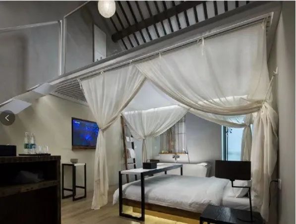 有一次我去乌镇,也是这样子的,床甚至还有蚊帐,我一辈子都没睡过蚊帐,因此一夜无眠。