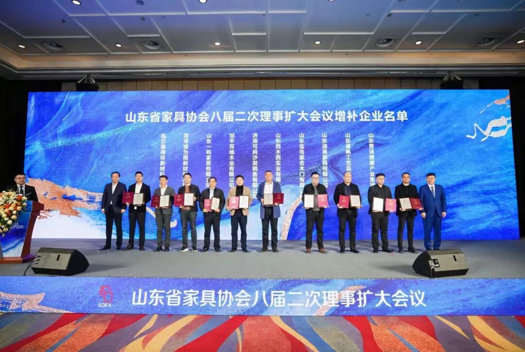 随后,山东省家具协会秘书长王腾宣读增补理事单位名单,山东普泽健康产业集团有限公司、山东睿帆工艺品有限公司、山东迪美家具有限公司、山东宝岛家合木门有限公司、山东西木西实业有限公司、济南可尚沙发销售有限公司、邹平双杨木业有限公司、山东一鸣家居有限公司、菏泽狼为图新材料科技有限公司、临沂健康得祥新材料有限公司共 10 家企业入选。山东省家具协会会长/青岛一木集团有限责任公司总裁刘少龙与山东省家具协会轮值会长/山东凤阳家居有限公司董事长邸喜宁为增补企业授牌及证书。