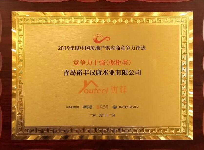 历经1915家开发商在线推荐、100位采购专家线下评审、300万人次网络投票及云采购30万条大数据四大关卡比拼后,优菲家居凭借独特的品牌战略、创新的制造技术、尖端的设计研发和完美的交付能力,荣获“2019年度中国房地产供应商竞争力评选竞争力十强(橱柜类)”奖项。这已是优菲家居连续第三年荣获该奖项。