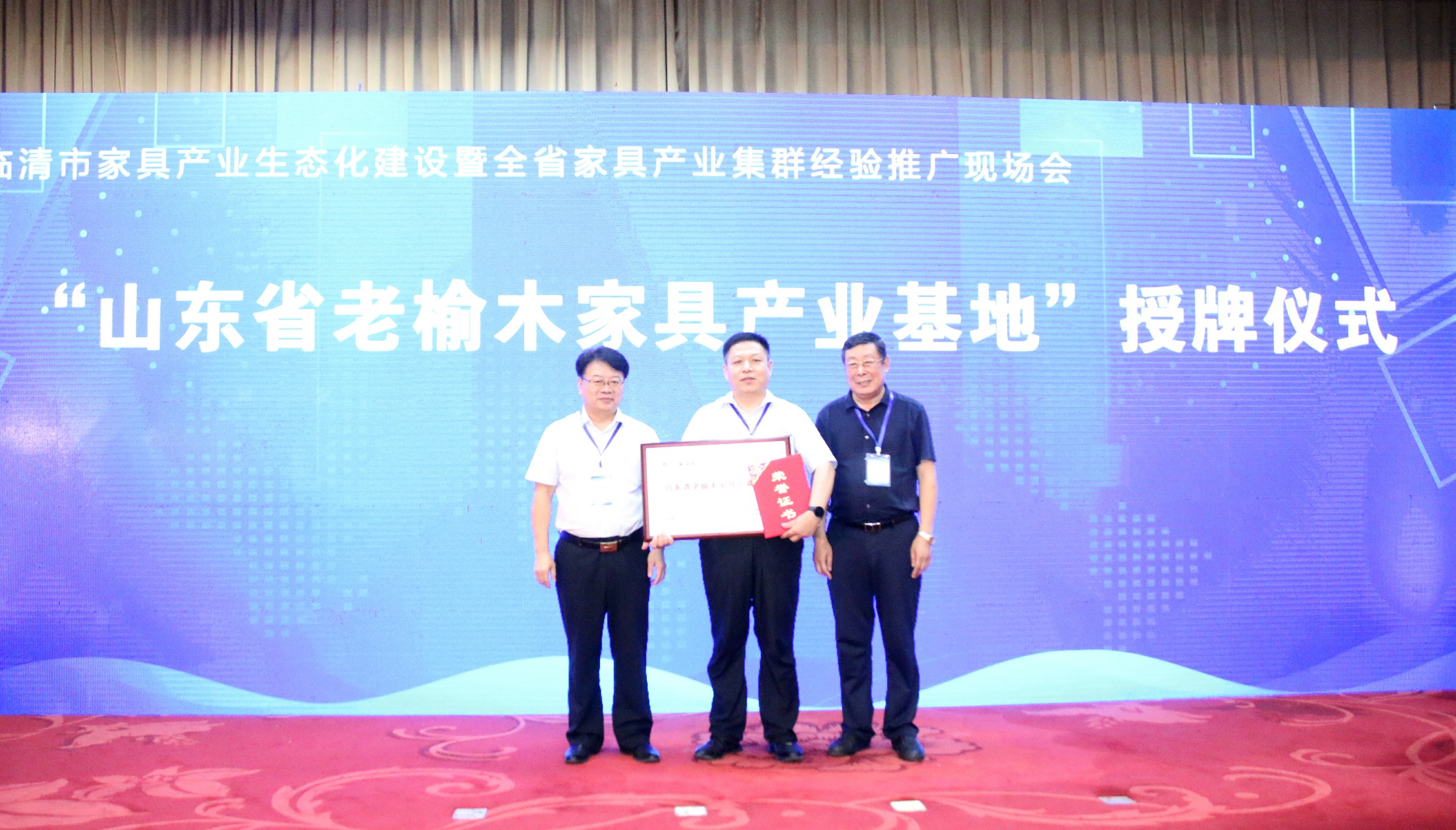 会上,聊城市政协副主席葛敬方首先致辞,对与会嘉宾的到来表示热烈欢迎,并对聊城市近年来工业发展及产业集群情况进行了介绍。山东省轻工联社党组成员/理事会副主任李修德宣读了省轻工联社“关于山东省老榆木家具产业基地”批复文件,由山东省工业和信息化厅二级巡视员张忠军、聊城市政协副主席葛敬方共同为临清市颁发特色产业基地铜牌和证书,标志着山东省家具产业集群在生态化建设方面又迈出了坚实一步。