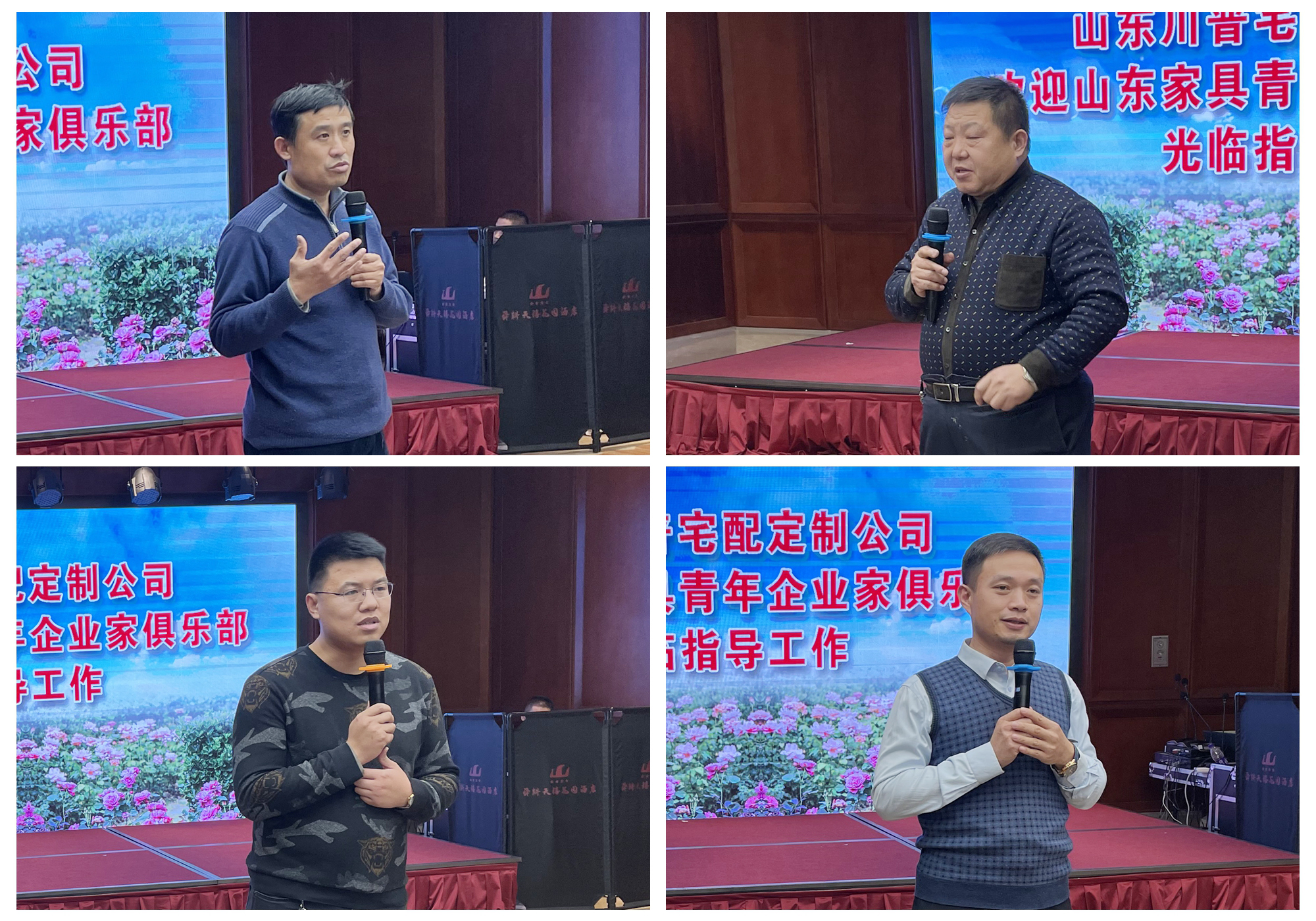 随后,游学团赴山东川普宅配定制有限公司参观学习并召开年会,川普宅配总经理姚庆振陪同参观,并对公司的主营业务和新材料的研发应用作了详细的讲解。年会上,川普宅配总经理姚庆振首先致欢迎词,对青年企业家的到来表示了真挚的欢迎。随后,俱乐部企业家纷纷上台发言,讲述了自己对行业未来发展趋势的看法与企业发展规划。最后,山东省家具协会副会长/秘书长/青年企业家俱乐部理事长韩庆生作总结发言,倡导山东青年企业家要在低头做事的同时,更要抬头看路和埋头学习,只有这样才能更清晰地放眼未来、健康发展。