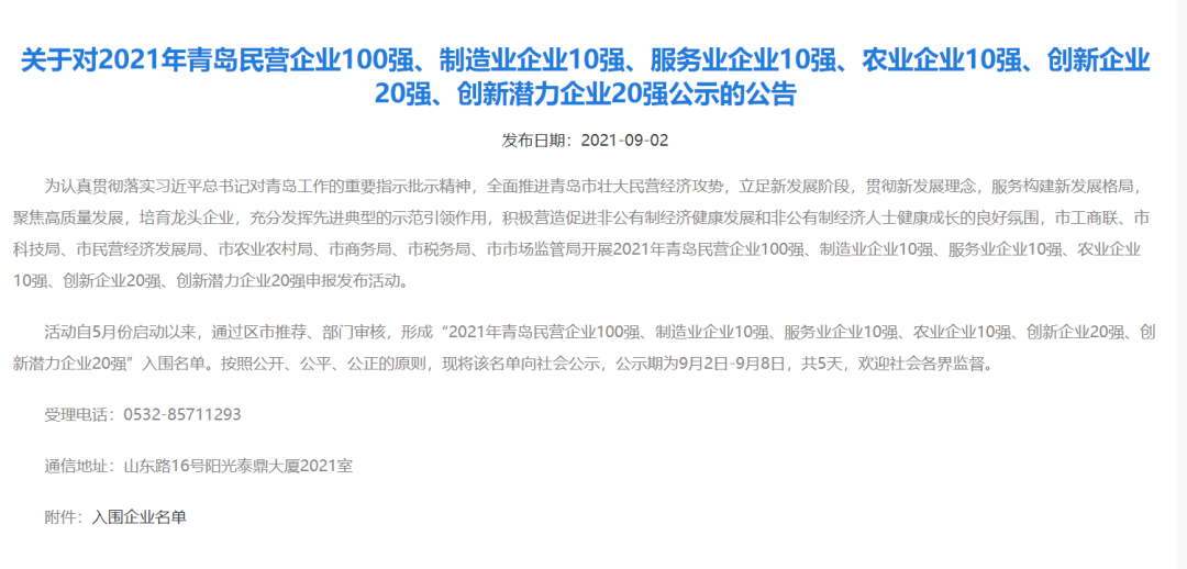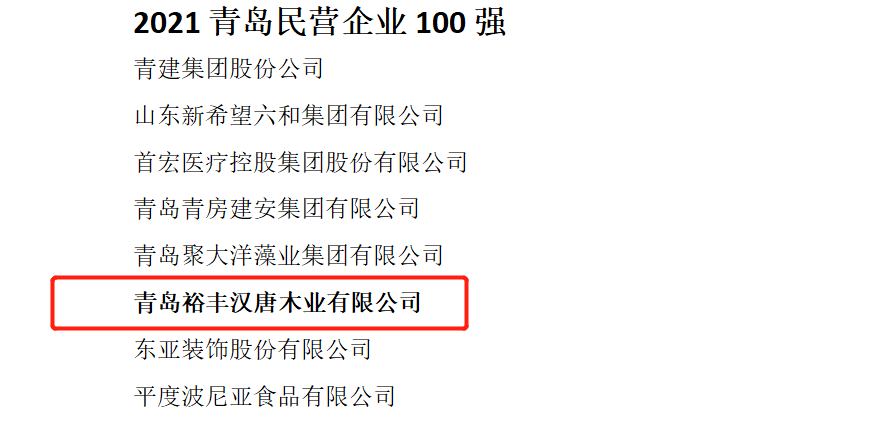 山东省家具协会会长单位/青岛裕丰汉唐木业有限公司荣获2021年青岛民营企业100强