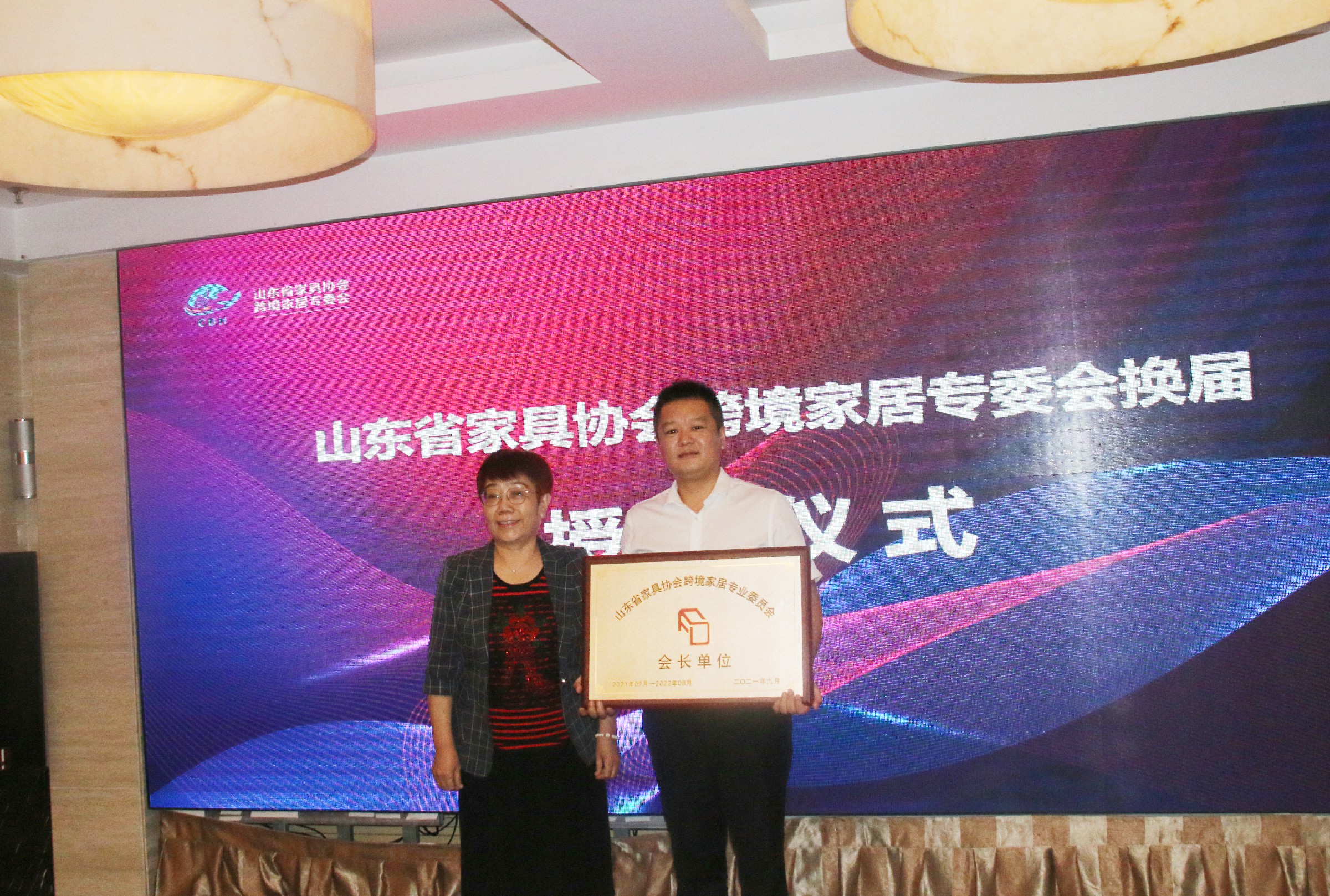 现场进行山东省家具协会跨境家居专委会的换届授牌仪式,经过前期投票选举,山东俏家-爱格装饰材料有限公司总经理段成才被一致推选为新一届会长,山东省家具协会执行会长牛广霞亲自为新任会长颁发了会长单位荣誉牌匾。段成才会长发表就职演讲,他表示很荣幸接过新任会长接力棒,在未来任期中将树立创新意识、服务意识,加强专委会会员对接联系,促进行业资源的高效合作和开发。