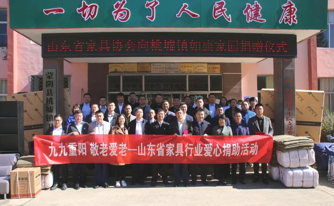 在我国传统节日——九九重阳节来临之际,10月12日,由山东省家具协会发起的“九九重阳 敬老爱老”-山东省家具行业爱心捐助活动在临沂市蒙阴县桃墟镇如康家园敬老院成功举办。山东省家具协会副会长/秘书长韩庆生、蒙阴县残联理事长孟庆琳、蒙阴县健康促进中心主任孙克民、蒙阴县桃墟镇镇长王燕、市派华强集团红领书记李海宁等领导出席捐赠仪式,山东省家具协会组织山东水波尔家居有限公司、山东仕全兴新材料有限公司、欧普家居、华强鲁南家具城、山东蓝图家具制造有限公司、兰华国际品牌家具博览中心、山东福港森桦木业有限公司、深圳菲尼莫家居有限公司、费县隆升塑胶制品厂等企业捐助了家具、食用油、大米、面粉、被褥等近十万元物资。