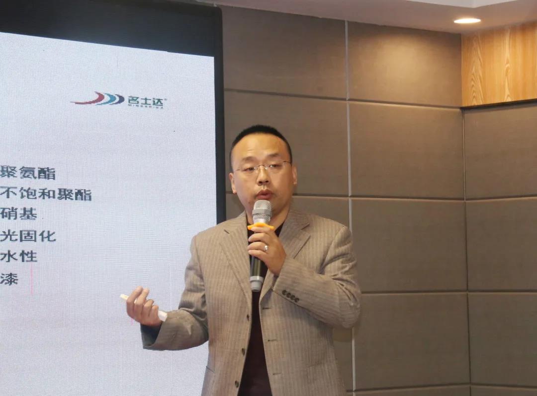 漆谷(北京)科技集团技术工程师石新利作《水性漆应用技术升级探索及现代涂装流行趋势》主题演讲,介绍了木器涂料的发展及现状,从公司新产品、产品性能、优势、施工工艺等方面进行详细介绍,为企业的健康发展助力。郑州视创品牌策划有限公司总经理李大洁作《品牌新生 唤醒增长》主题演讲,李总从企业发展痛点入手,指出应企业从市场、消费者、品牌、使命等四方面梳理发展方向,并结合公司服务项目、成功合作案例说明了品牌在公司发展中的重要性。济南品脉数控设备有限公司销售主管王贵强作《数控自动化设备在家具行业的应用趋势》主题演讲,王经理分享了公司主要产品、产品优势及公司发展规划,为企业智能制造提供解决方案。