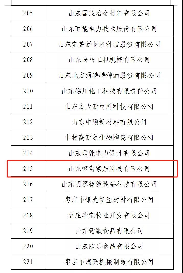 2021年10月29日,山东恒富家居科技有限公司在省工业和信息化厅牵头组织开展的关于2021年度瞪羚、独角兽企业评选工作中,成功入围2021年度瞪羚企业名单。