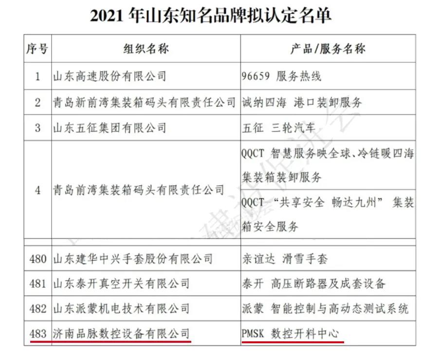 山东省品牌建设促进会发布了关于公示2021年山东知名品牌拟认定名单的公告。济南品脉数控设备有限公司《PMSK数控开料中心》被认定为山东知名品牌。