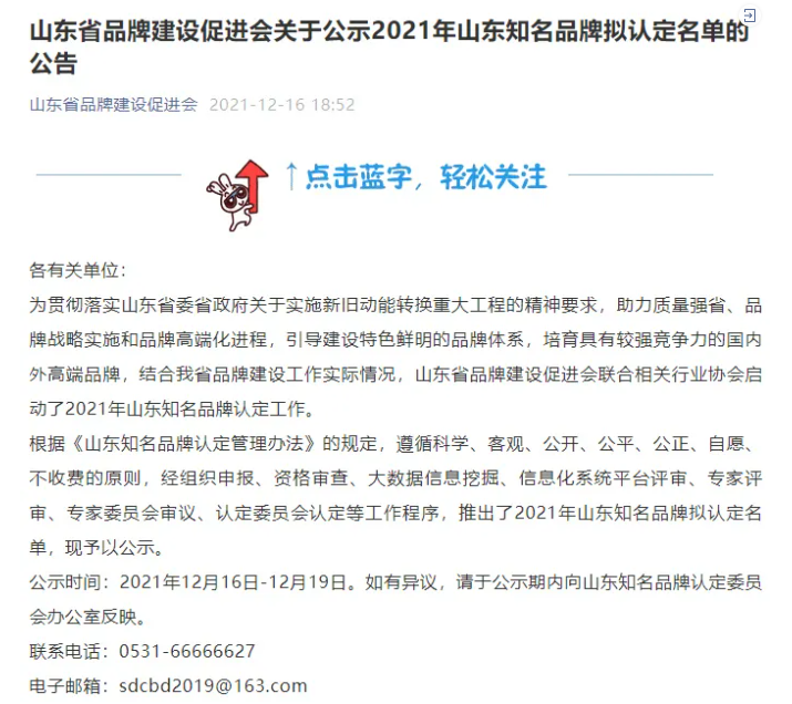 山东省品牌建设促进会关于公示2021年山东知名品牌拟定名单的公告