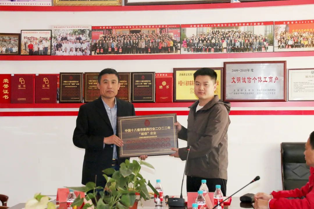随后,永盛家居公司新组建的实木家具事业部、软体家具事业部团队宣誓就职,各部门负责人分别就今年目标任务、团队打造、实施措施做了发言,并与公司签订了军令状。济南永盛家居科技有限公司始终将诚信作为企业的核心经营理念,山东省家具协会副会长/秘书长韩庆生向济南永盛家居科技有限公司颁发了“2022年度十八省市家具行业诚信企业”牌匾。