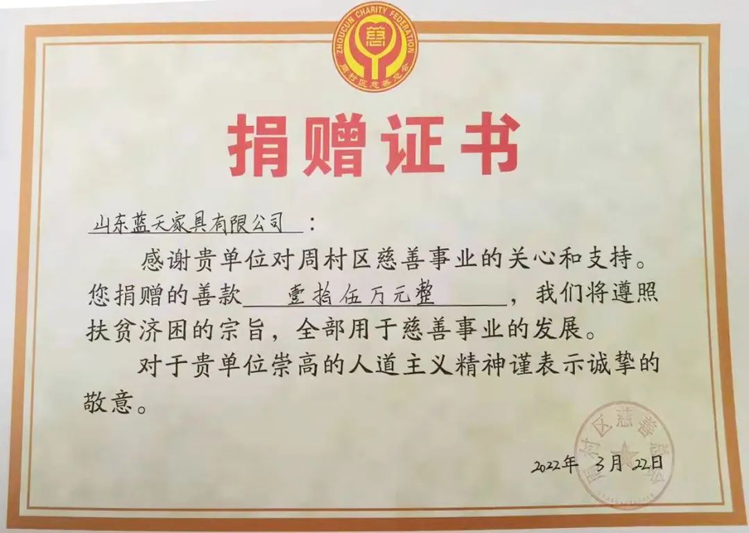 山东省家具协会副会长单位—山东蓝天家具有限公司始终坚持爱心、利他的企业文化,坚持为社会做贡献。公司积极响应周村区慈善总会倡议的 “抗疫有我,守望相助”捐赠活动,捐赠了15万元的抗疫专款,以实际行动传递爱心,助力打赢疫情防控阻击战。同时公司还为大街街道办事处捐款3万元,为和平社区捐款2万元,帮助街道筹备物资共克时艰!