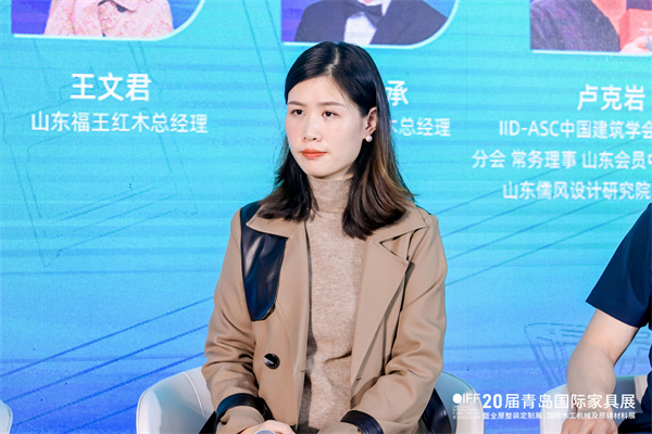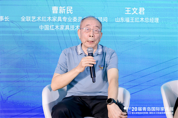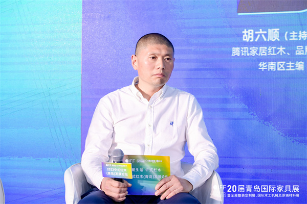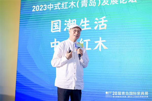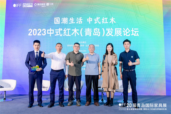 在2023中式红木(青岛)论坛主题对话环节,全联艺术红木家具专业委员会专家顾问、中国红木家具技术专家曹新民,东阳古森红木董事长吴飞阳,IID-ASC中国建筑学会室内设计分会常务理事山东会员中心负责人、山东儒风设计研究院创意总监卢克岩,山东福王红木总经理王文君,山东陈氏红木总经理陈炳承嘉宾围绕“国潮生活 中式红木”主题,解读了红木家具的新趋势和新机遇。