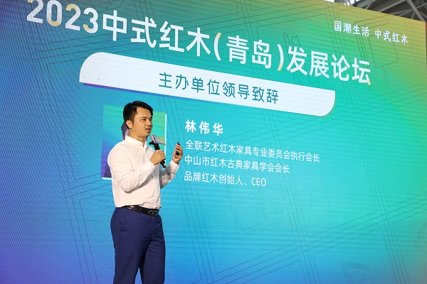 如今,传统文化在不断释放更强活力,国潮形成展现中国文化自信的浪潮,并逐渐融入大众日常生活。全联艺术红木家具专业委员会执行会长、中山市红木古典家具学会会长、品牌红木CEO 林伟华致辞指出,品牌与数字化是每个红木家具企业的未来之路,要让红木成国潮代言,让国人爱上国货红木。青岛国际家具展的开幕及2023中式红木(青岛)发展论坛论坛的举办,将会掀起一股势不可挡的国潮之风,极大促进国货红木的品牌化发展。