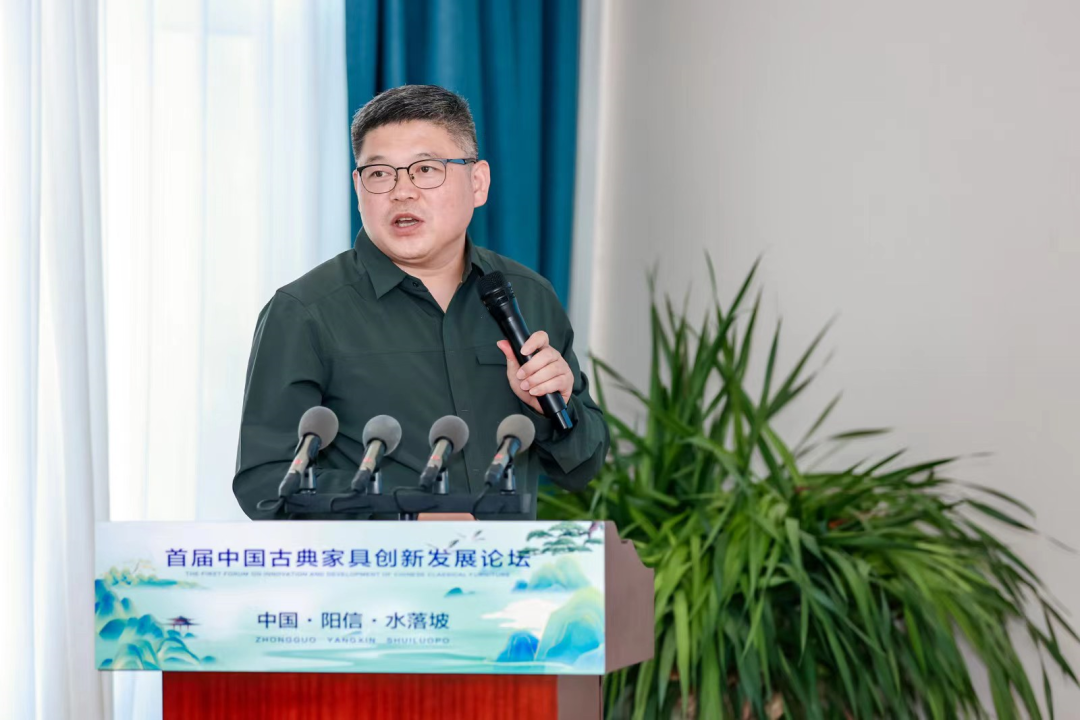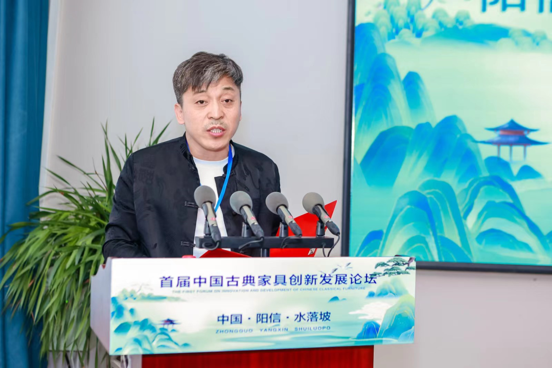 山东省家具协会副会长/秘书长韩庆生致辞,他指出,水落坡古典家具文化发展历史悠久,文化内涵丰富,是山东阳信古典家具文化产业高地和中国古典家具与民俗文化的一张靓丽名片,未来要通过家具博览会、艺术文化节以及论坛等多种形式,持续推动古典家具文化的发展以及与民俗文化和山东手造的有机融合,打造古典家具的良性产业基地。