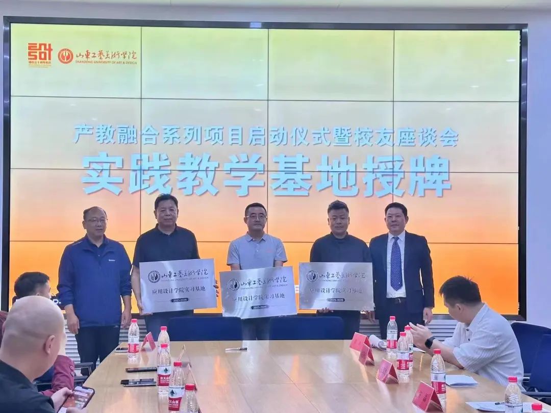 产教融合系列活动启动仪式上,山东工艺美术学院党委委员/组织部部长许磊和应用设计学院党总支书记张军波分别给山东欧克家具有限公司、百隆家具配件有限公司、山东好乐家住宅设施有限公司三家企业代表进行了实践教学基地授牌。