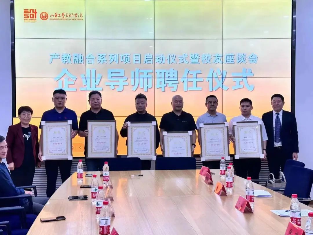 接下来,企业导师聘任仪式上,山东工艺美术学院党委委员/组织部部长许磊和山东省家具协会执行会长牛广霞分别为山东好乐家住宅设施有限公司总经理尹洪庆、山东欧克家具有限公司营销总监陈岭、青岛海尔全屋家具有限公司总经理侯雪峰、百隆家具配件有限公司山东分公司经理肖峰刚、愉悦家纺研创中心副总监/校友杨青亮、南京点线面家具设计有限公司设计总监/校友潘亚闯六位合作导师代表颁发了聘书。