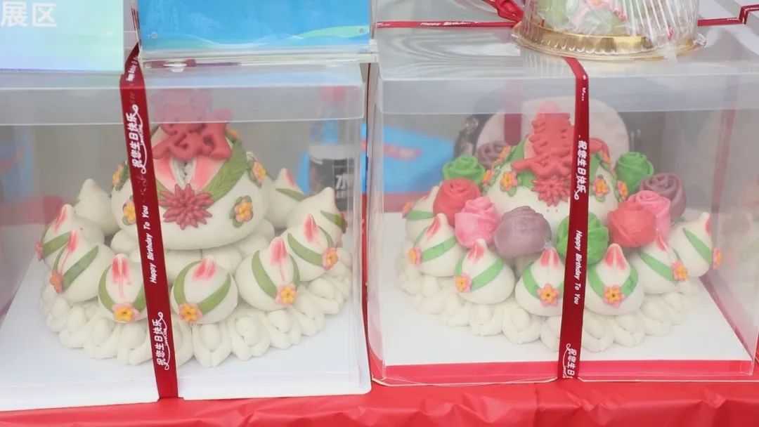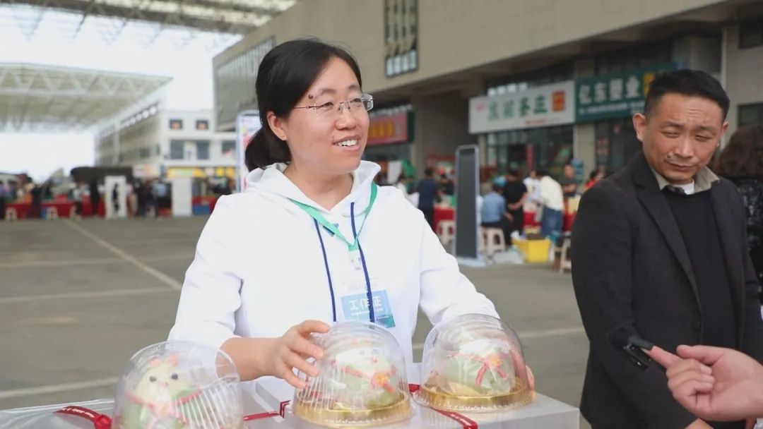 “开口笑馒头一出锅端出来,就被大家抢空了。现在这个是我们冷冻了的,加热以后口感也一样。小鸡花馍是今年为新泰炒鸡大赛专门定制的一款。为孩子们准备的这款‘粽粽兔’也比较受欢迎。”